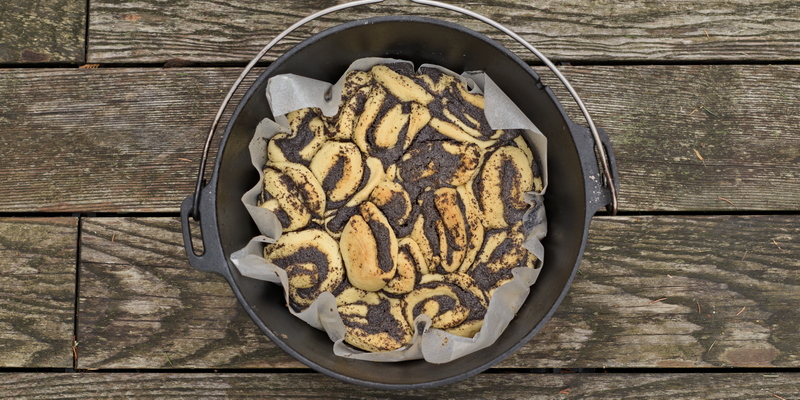 Den Teil nochmals kneten und zu einem Rechteck ausrollen. Die Mohnmasse gleichmäßig mit einem Löffel auf dem Teig verteilen. Den Teig nun aufrollen, die Rolle vorsichtig! in gut 3-4 cm dicke Scheiben schneiden und in den mit Backpapier ausgelegten und etwas vorgewärmten Dutch Oven geben. Mohnschnecken etwas flachdrücken und nochmals etwa 20 min gehen lassen.